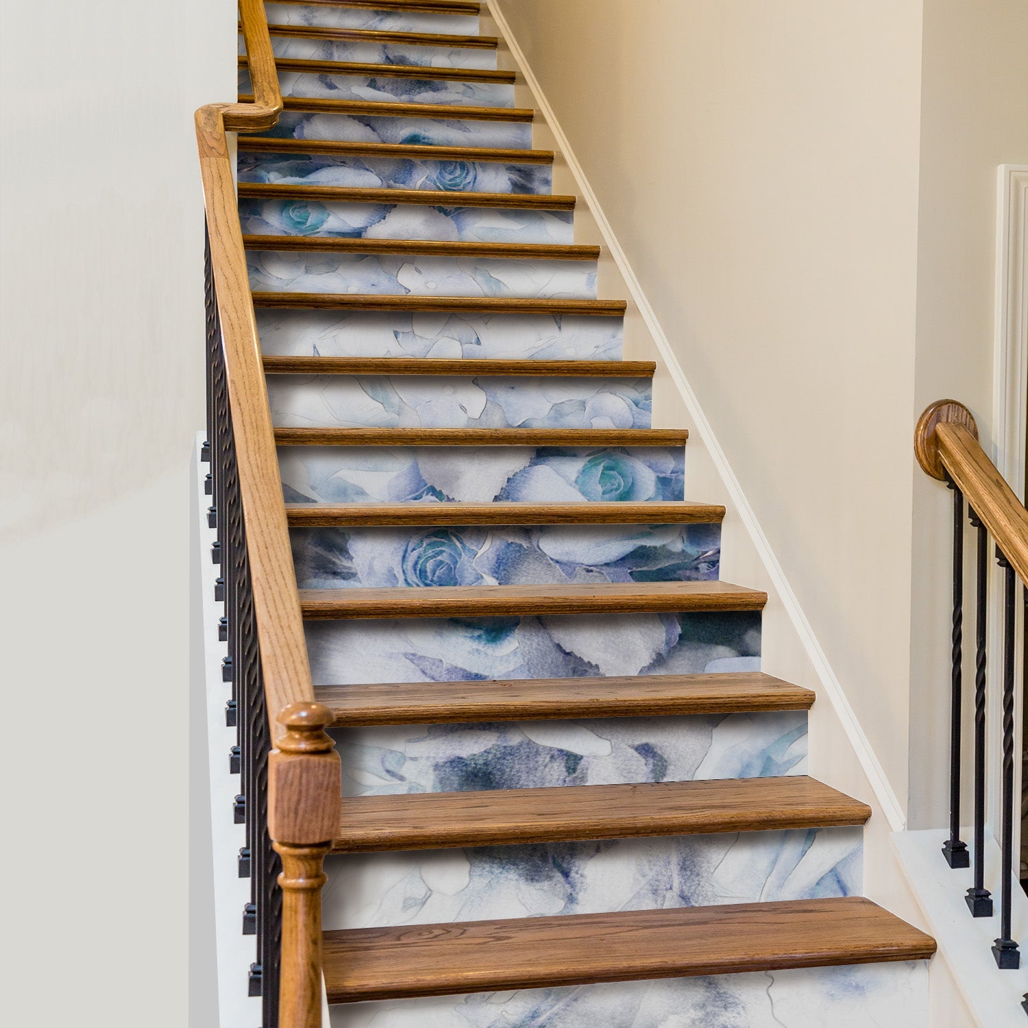 15 PCS Peel and Stick Flower Stair Stickers, Self Adhesive Vinyl Stair Risers Decals, Staircase Murals Decor for Steps, 39.37'x7.09' Blue Rose